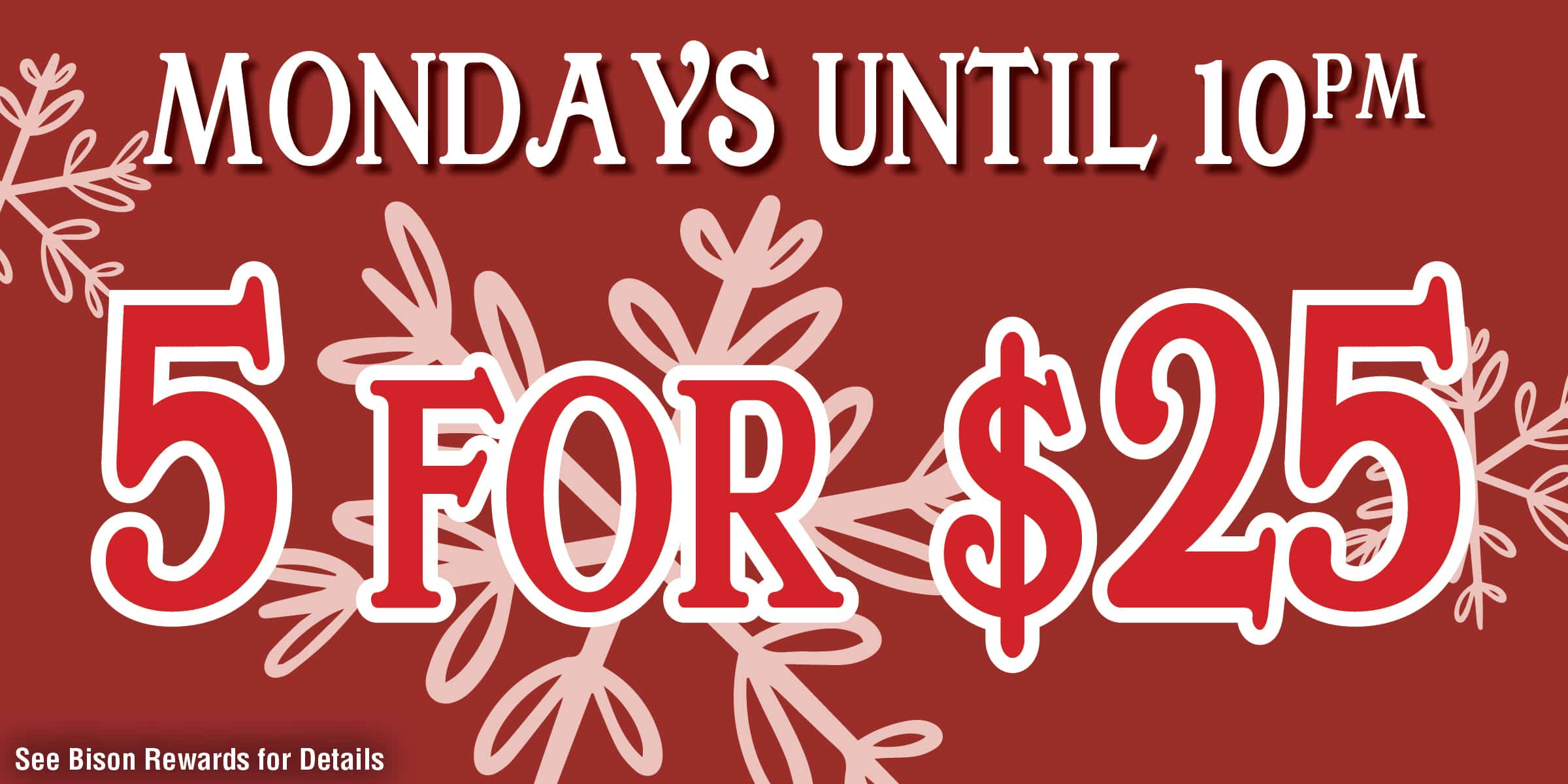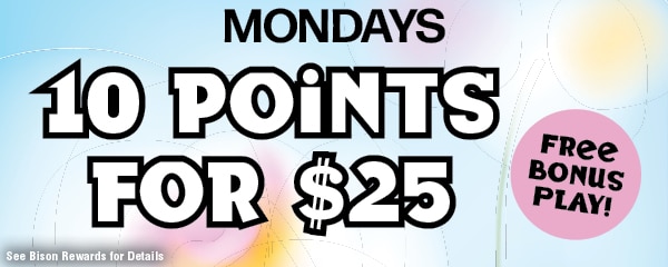 MONDAY- 10 for $30 Mondays – Bison Rewards Members playing with their Bison Rewards card have the opportunity to claim $30 in bonus play when they earn 10 points on their Rewards card. Guests can only claim once per Monday in January. Slot play expires 7 days after activation.