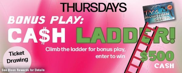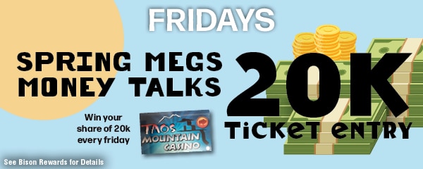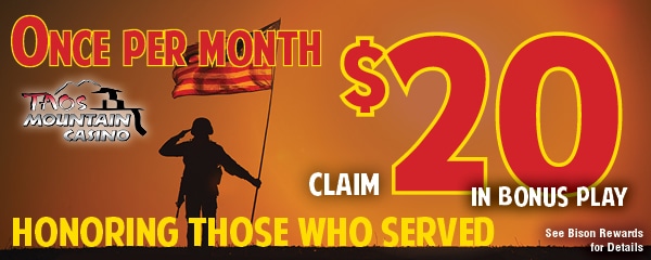 WEDNESDAY- Taos Pueblo Day- Taos Pueblo Tribal members with no expired tribal ID for the Taos Pueblo and Bison Card carriers, will have the opportunity to claim $10 in bonus play. Players must earn 3 points on their Bisson Card. Can only be claimed once per promotional Wednesday for the month.