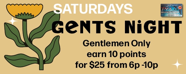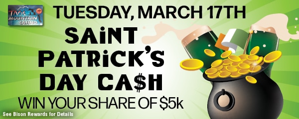NYE 12K Cash- Ring in the New Year with the NYE 12K Cash Giveaway at Taos Mountain Casino. From December 29 through December 31, Bison Rewards members can qualify every hour between 12 PM and 11:59 PM for their chance to win a share of $12,000. Guests earn one entry ticket for every 50 points earned on their Bison Rewards card while playing their favorite slot machines. Members can earn unlimited entries, and each guest may win once and remain eligible for the grand prize drawing of $12,026.