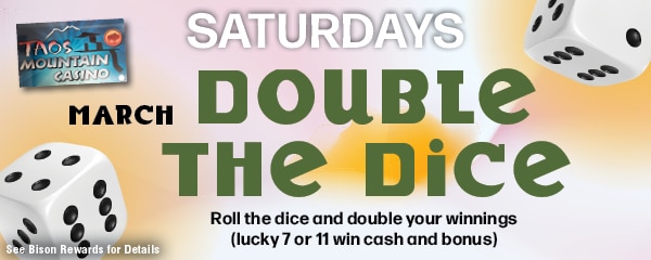 SATURDAY – WINTER BONUS AND CASH WONDERLAND- Bison Rewards members will have the chance to participate in Taos Mountain Casino’s Winter Bonus & Cash Blast Hot Seats each Saturday in January from 11 a.m. to 11 p.m., with one winner randomly selected every hour. To be eligible, Bison Card holders must earn 15 points using their Bison Rewards card and have their card present at the time of the drawing. Each winner will receive $100 in cash and $100 in bonus play, and guests may win up to two times per promotion day. Bonus play expires 7 days after being loaded onto the Bison card.