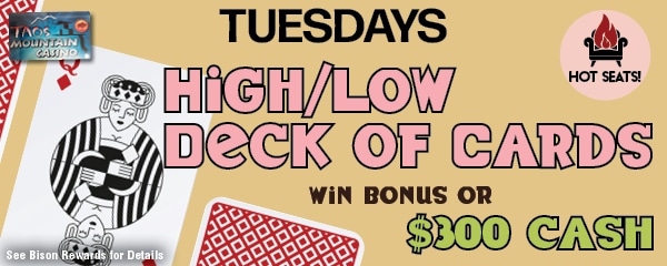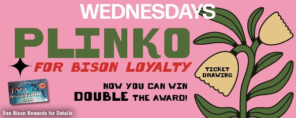 WEDNESDAY- Plinko — Bison Rewards must earn 20 points to participate in the ticket drawing, with a chance to win $75 bonus up to $500 cash once they’ve claimed their tickets (one per 20 points) and placed them in the drum. Drawings at the top of the hour from 11am to 9 pm on Wednesdays. If your ticket is drawn, you’re eligible to drop four Plinko balls down the board to claim the largest denomination of cash or bonus. Bison card holders can win twice.